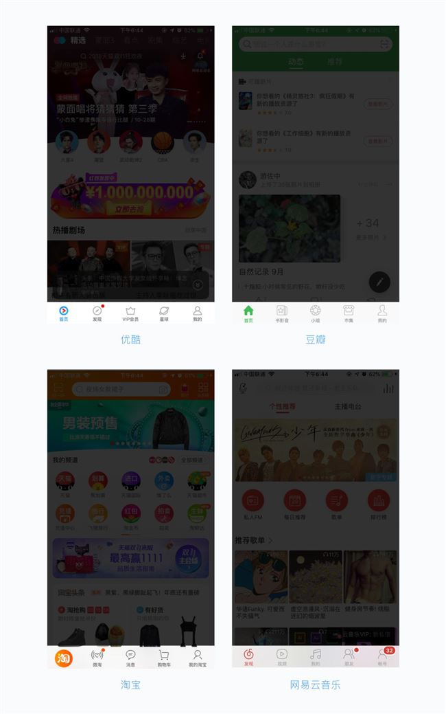 底部導(dǎo)航欄設(shè)計是我們最常見的導(dǎo)航模式之一,位于頁面底部,用于一級頁面當(dāng)中負(fù)責(zé)各主業(yè)務(wù)模塊的切換,一般會保持3~ 5 個標(biāo)簽,適用于頻繁切換業(yè)務(wù)模塊的產(chǎn)品。例如優(yōu)酷、豆瓣、淘寶、網(wǎng)易云音樂: