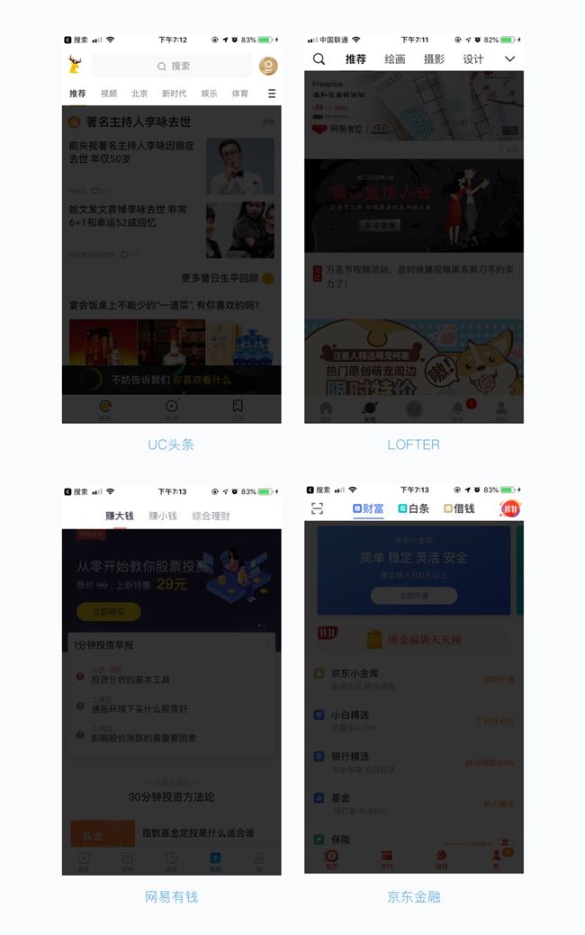 頂部導(dǎo)航欄位于頁面頂部,一般位于導(dǎo)航欄或者狀態(tài)欄下方,用作于二級導(dǎo)航,基本都以純文字的形式出現(xiàn)(幸免干擾用戶掃瞄 頁面核心內(nèi)容),常見的頂部導(dǎo)航欄有:固定頂部標(biāo)簽導(dǎo)航&可滑動標(biāo)簽導(dǎo)航。例如UC頭條、LOFTER、網(wǎng)易有錢、京東金融: