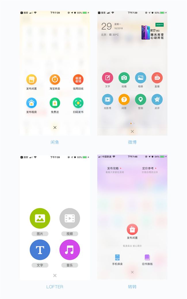 舵式導(dǎo)航一般位于底部標(biāo)簽欄中間,以“+”號 的形式出現(xiàn),是產(chǎn)品中需要重點(diǎn)突出的功能,一般用于UGC內(nèi)容生產(chǎn)公布。例如閑魚、微博、LOFTER、轉(zhuǎn)轉(zhuǎn):