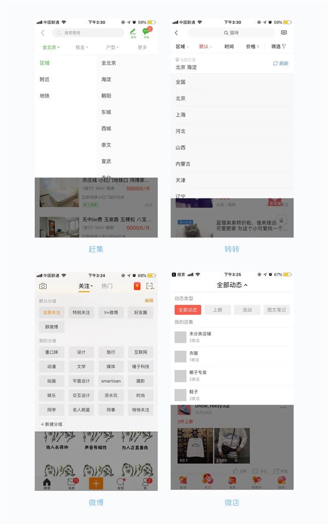 下拉式導(dǎo)航與抽屜導(dǎo)航類似,將非核心功能隱藏。這列導(dǎo)航多用于二級導(dǎo)航;基本都以半浮層的形式展現(xiàn),點(diǎn)擊浮層意外的區(qū)域自動收起;對比側(cè)邊欄導(dǎo)航,下拉導(dǎo)航能讓用戶清楚感知當(dāng)前所在位置。例如趕集、轉(zhuǎn)轉(zhuǎn)、微博、微店: