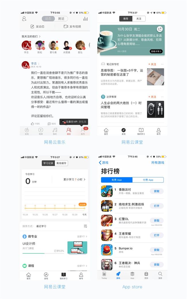 分段式導(dǎo)航是 iOS 自帶的標(biāo)準(zhǔn)控件,一般應(yīng)用于二級導(dǎo)航,適合切換頻率比較高的頁面,導(dǎo)航數(shù)量通常在2~ 4 個。例如網(wǎng)易音樂、網(wǎng)易云課堂、app store: